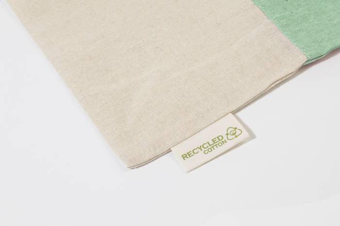 Kéttónusú, újrahasznosított pamut bevásárlótáska, hosszú hordfüllel, betoldással és megkülönböztető újrahasznosított pamut címkével. 100% újrahasznosított pamut, 120 g/m².