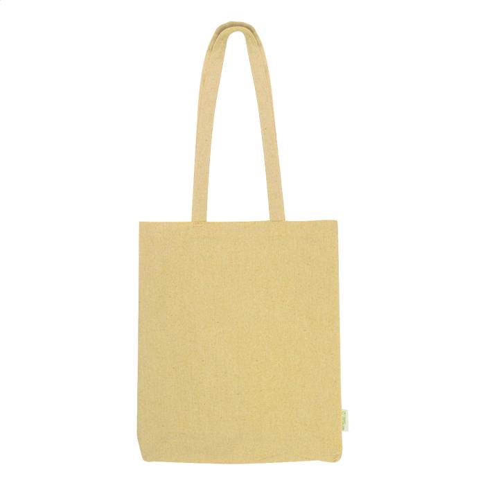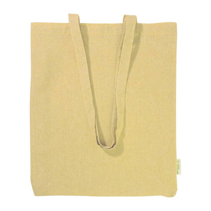 Többször használható, újrahasznosított pamut bevásárlótáska hosszú fülekkel. 100% újrahasznosított pamut, 140 g/m².