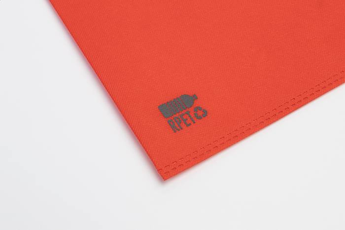 RPET non-woven bevásárlótáska kivágott hordfüllel, 70 g/m². Megkülönböztető RPET felirattal.