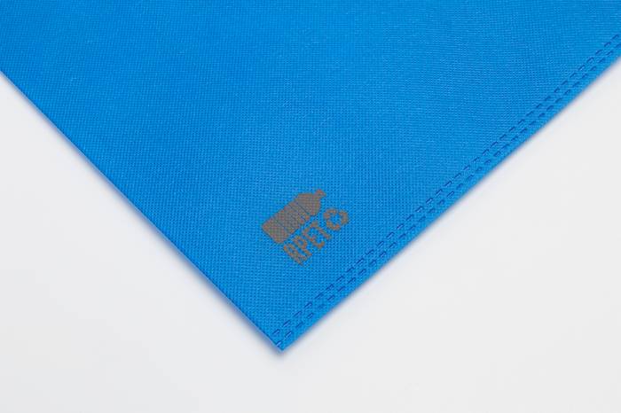 RPET non-woven bevásárlótáska kivágott hordfüllel, 70 g/m². Megkülönböztető RPET felirattal.