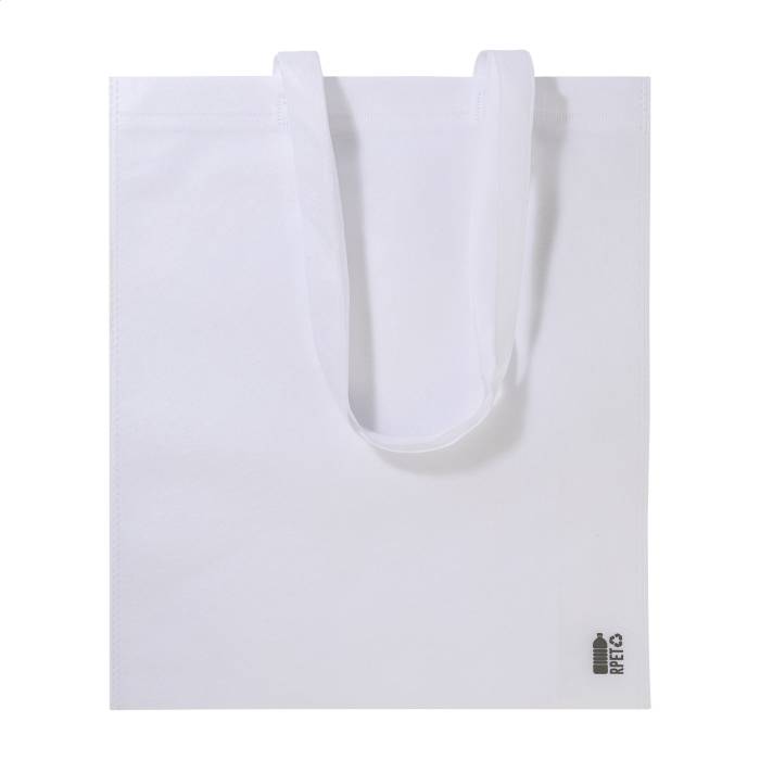 RPET non-woven bevásárlótáska hosszú hordfüllel, 70 g/m². Megkülönböztető RPET felirattal.