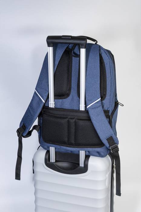 RPET hátizsák cipzáras rekeszekkel, 2 cipzáras elülső zsebbel, cipzáras oldalsó zsebekkel és párnázott laptop rekesszel (15"-os). Párnázott hát- és vállpántokkal, lopásgátló zsebbel és bőrönd pánttal. 300D RPET poliészterből, megkülönböztető RPET címkével.