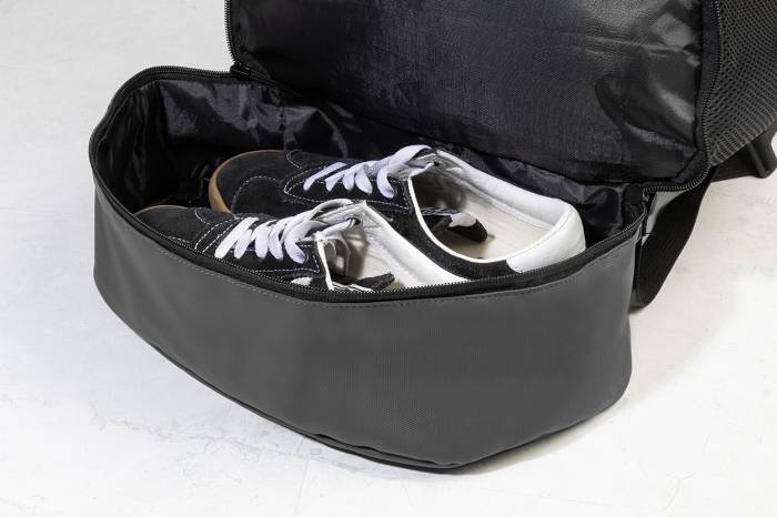 Prémium minőségű RPET zsinóros hátizsák, cipzáras cipőrekesszel, hálós oldalsó betétekkel és széles pántokkal. Műbór bevonatú 600D RPET poliészter, megkülönböztető RPET címkével.