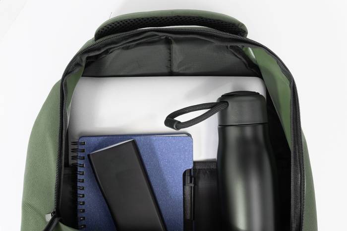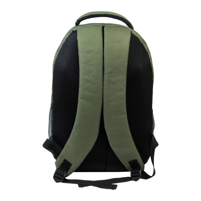 RPET kültéri hátizsák cipzáras rekeszekkel és elülső zsebbel, párnázott laptop rekesszel (15"), hálós oldalsó zsebekkel és elöl rugalmas zsinórokkal. Párnázott hátrésszel és vállpántokkal. 600D RPET poliészterből, megkülönböztető RPET címkével.