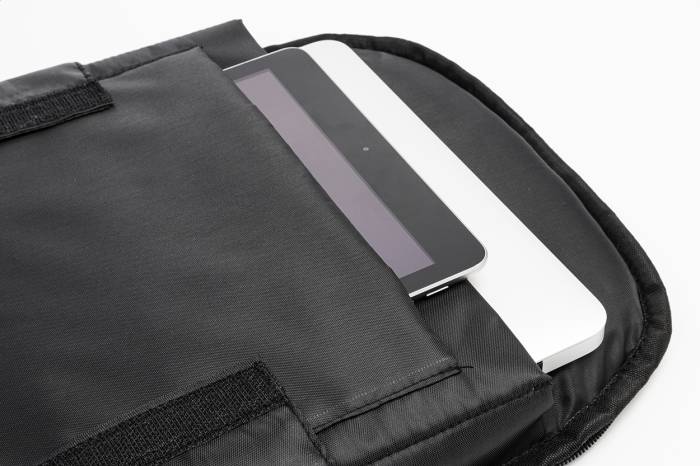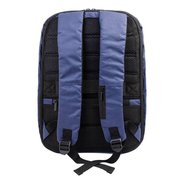 RPET lopásgátló hátizsák cipzáras rekesszel, párnázott laptop (15") és tablet (12") rekesszel, bőrönd pánttal, párnázott hát- és vállpántokkal. Rejtett lopásgátló zsebbel. 300D RPET poliészter. Megkülönböztető RPET címkével.