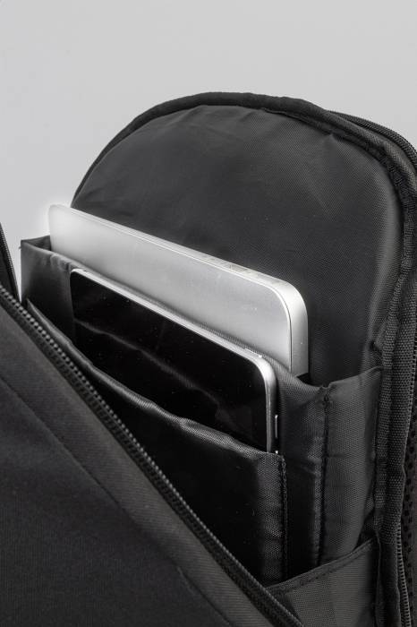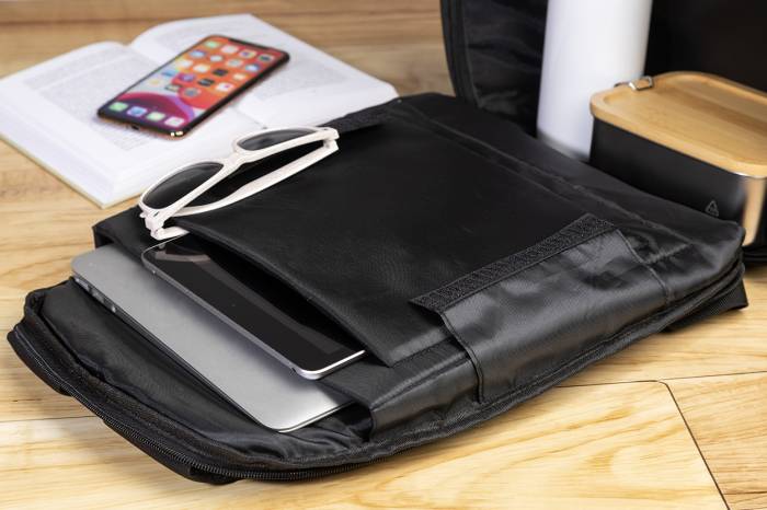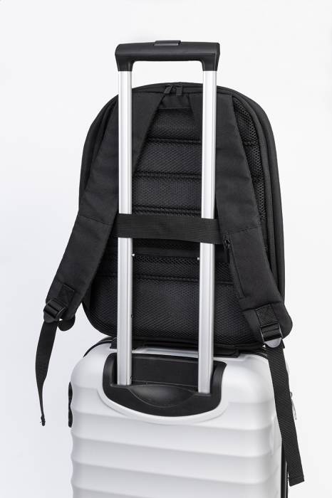 RPET lopásgátló hátizsák cipzáras rekesszel, párnázott laptop (15") és tablet (12") rekesszel, bőrönd pánttal, párnázott hát- és vállpántokkal. Rejtett lopásgátló zsebbel. 300D RPET poliészter. Megkülönböztető RPET címkével.