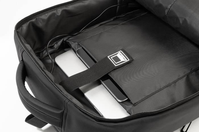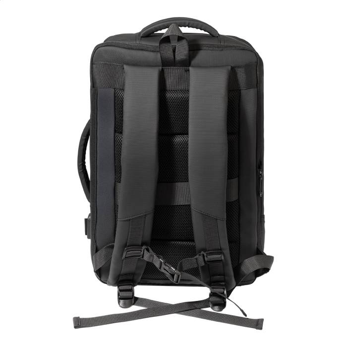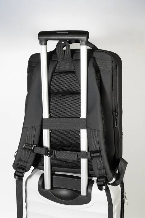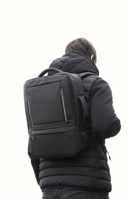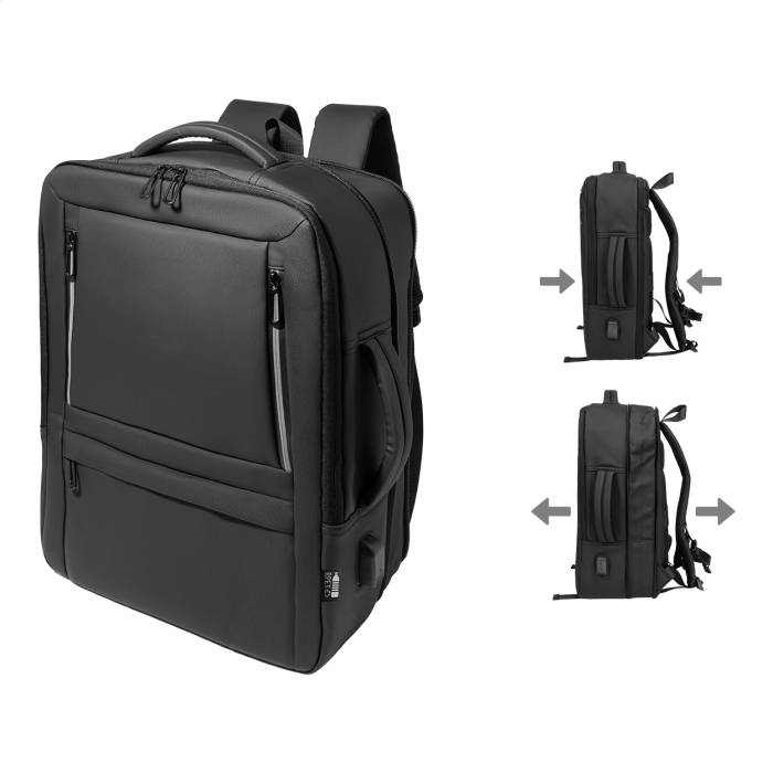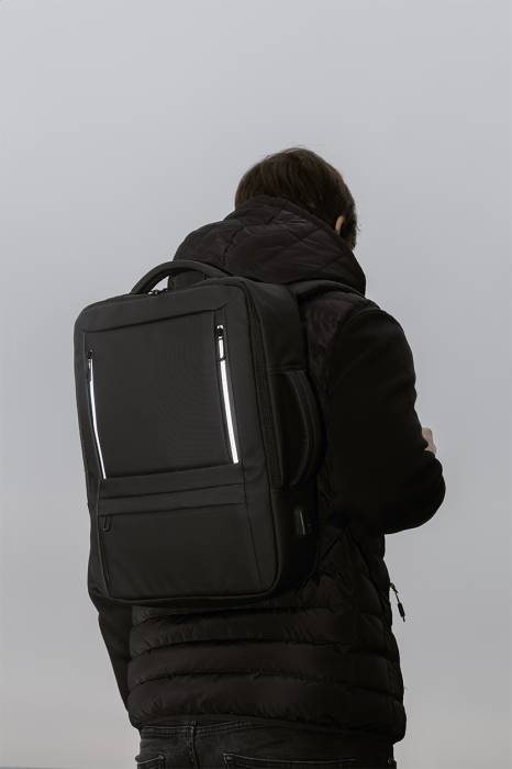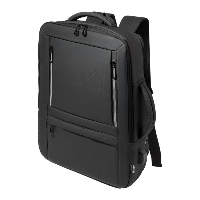 Vízálló, RPET anyagból készült, bővíthető hátizsák és irattáska cipzáras fő rekesszel, fényvisszaverő cipzáras elülső zsebekkel, párnázott laptop (15") és tablet (12") rekesszel, valamint beépített USB-porttal külső akkumulátorok számára. Bőrönd pánttal, párnázott hát- és vállpántokkal, mellkasi pánttal. PU bevonatú 600D RPET poliészterből, megkülönböztető RPET címkével.