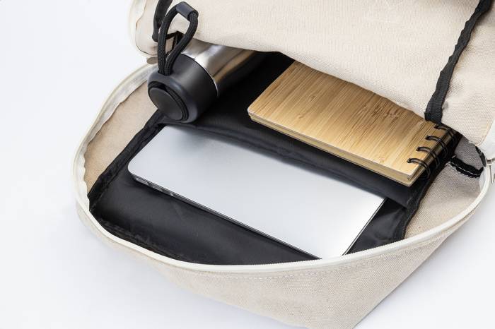 Újrahasznosított vászon hátizsák cipzáras fő rekesszel, párnázott laptop rekesszel (13") és tépőzáras elülső zsebbel. 70% újrahasznosított pamut és 30% RPET poliészter. Megkülönböztető újrahasznosított pamut címkével.