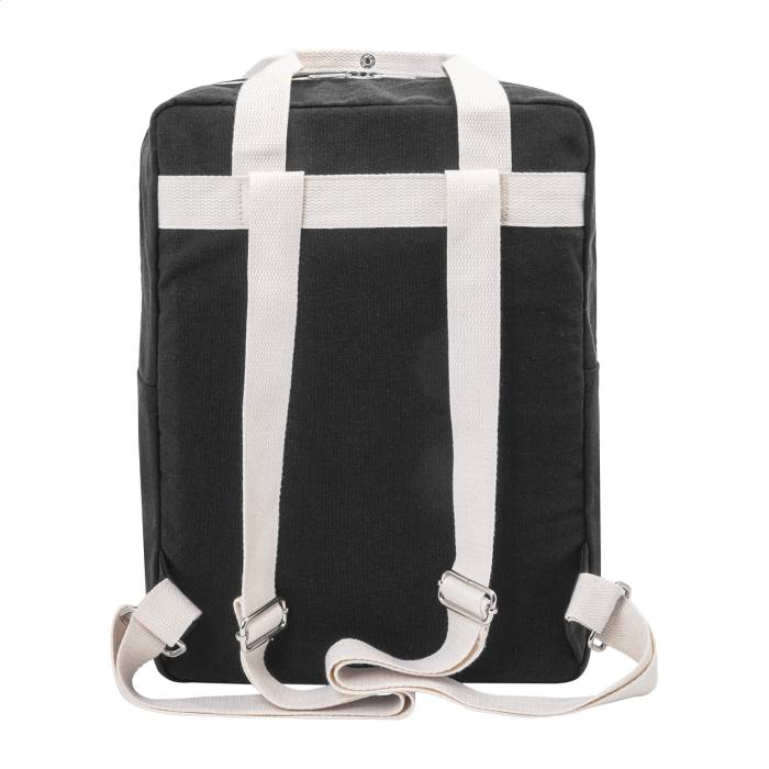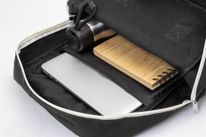 Újrahasznosított vászon hátizsák cipzáras fő rekesszel, párnázott laptop rekesszel (13") és tépőzáras elülső zsebbel. 70% újrahasznosított pamut és 30% RPET poliészter. Megkülönböztető újrahasznosított pamut címkével.