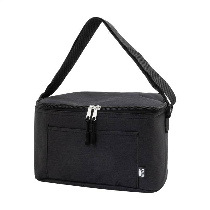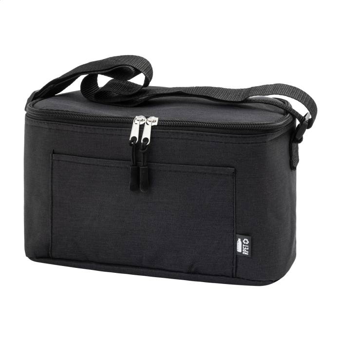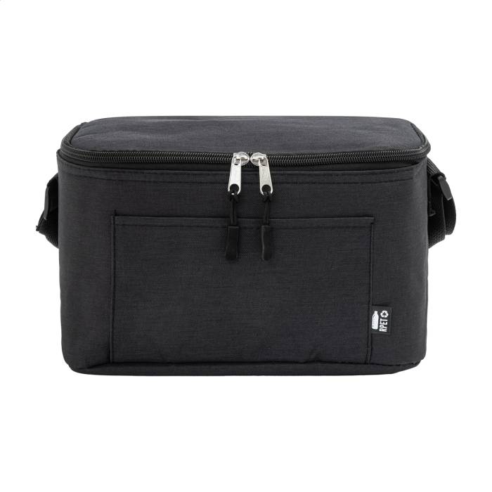 Cipzáras RPET hűtőtáska, alumínium béléssel, 6 db 0,33 L-es kannához. Elülső zsebbel és állítható vállpánttal. 600D RPET poliészter. Megkülönböztető RPET címkével.