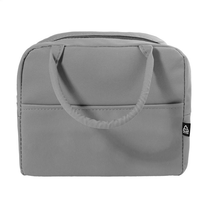 Cipzáras, puha, újrahasznosított PU műbőr hűtőtáska elülső zsebbel és alumínium béléssel. Megkülönböztető újrahasznosított PU címkével.
