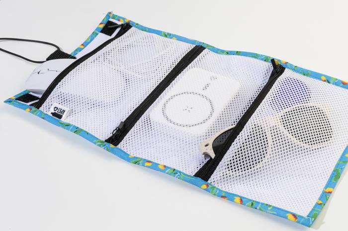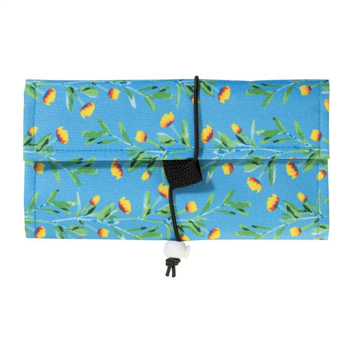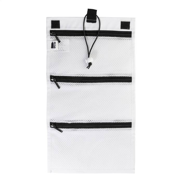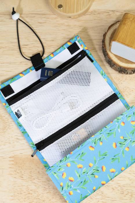 Egyedi gyártású, RPET kábelrendező tok 3 cipzáras hálós rekesszel és rugalmas pánttal. Teljes felületén szublimációs nyomtatott grafikával. 600D RPET poliészterből, megkülönböztető RPET címkével. Minimális rendelési mennyiség: 25 db.