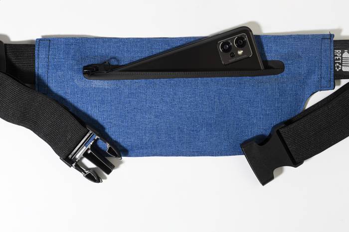 Vékony RPET övtáska cipzáras rekesszel és állítható rugalmas pánttal. 300D RPET poliészterből, megkülönböztető RPET címkével.