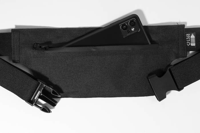 Vékony RPET övtáska cipzáras rekesszel és állítható rugalmas pánttal. 300D RPET poliészterből, megkülönböztető RPET címkével.