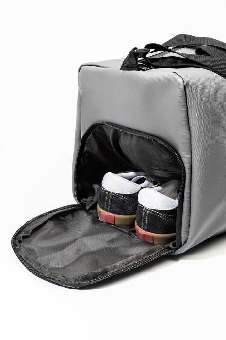 Vízálló, RPET sporttáska cipzáras fő rekesszel, cipzáras elülső zsebbel, cipzáras cipőtartó rekesszel és állítható vállpánttal. PU bevonatú 600D RPET poliészterből, megkülönböztető RPET címkével.