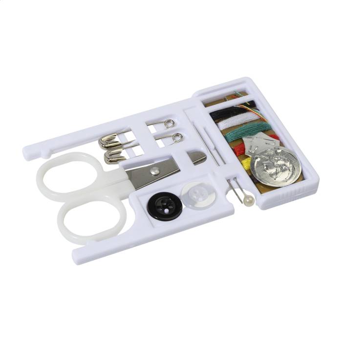 Kompakt utazó varrókészlet újrahasznosított PS tokban. 6 színes poliészter cérnát, biztosítótűt, tűt és 2 gombot tartalmaz.