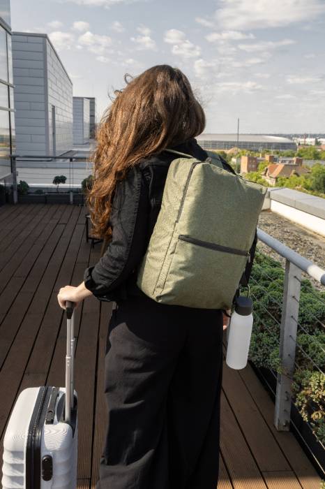 Kétfunkciós RPET dokumentum hátizsák cipzáras rekesszel, 2 cipzáras elülső zsebbel és párnázott laptop rekesszel (15"). Párnázott hátrésszel és vállpántokkal. Tartalmaz egy további levehető vállpántot, amely irattáskaként is használható. 600D RPET poliészter, megkülönböztető RPET címkével.